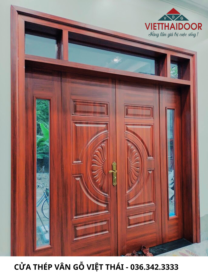 Cửa thép 4 cánh vân gỗ với nhiều ưu điểm về thẩm mỹ và công năng, được đánh giá là mẫu cửa phù hợp cho không gian phòng khách hiện đại. Vừa sang trọng lại phù hợp phong thủy, đáp ứng được mọi nhu cầu của gia chủ.